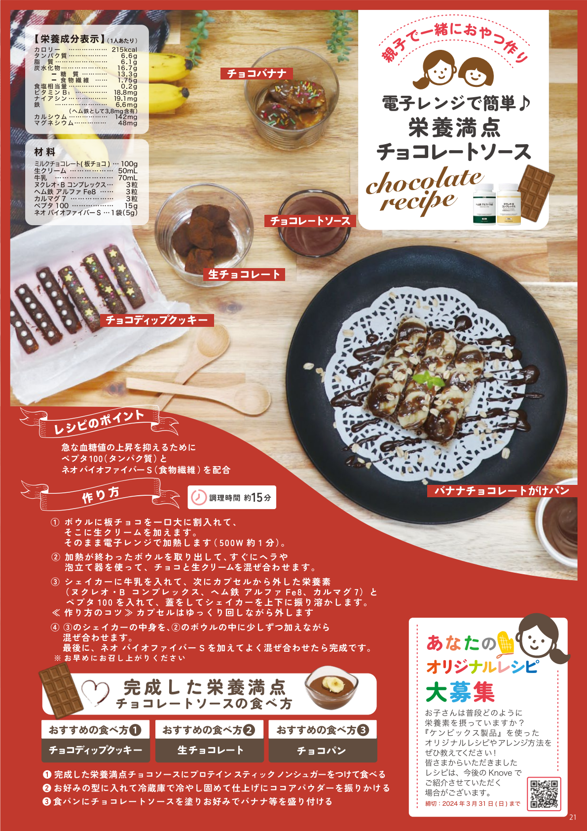 ミルクチョコレート(枚チョコ)・・・100g 生クリーム・・・50mL 牛乳・・・70mL ヌクレオ・Bコンプレックス・・・3粒 ヘム鉄アルファ Fe8・・・3粒 カルマグ 7・・・3粒 ペプタ 100・・・15g ネオバイオファイバーS・・・1袋(5g) | カロリー・・・215kcal タンパク質・・・6.6g 脂質・・・6.1g 炭水化物糖・・・16.7g 糖質・・・13.3 g 食物繊維・・・1.75 g 食塩相当量・・・0.2g ビタミンB1・・・18.8mg ナイアシン・・・19.1mg 鉄・・・6.6 mg (ヘム鉄として3.8mg含有) カルシウム・・・142mg マグネシウム・・・48mg |